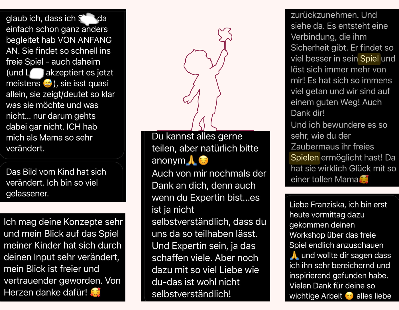 Liebe Franziska, ich möchte dir einfach mal Danke sagen. Seit deinem Vortrag haben wir unsere Haltung zum Spiel, die Spielzeugauswahl und unser Verhalten während des Spiels verändert und es hat sich so viel in unserem Familienleben getan. Das Spiel und das Spielverhalten unseres Sohnes haben sich so deutlich verändert. Er spielt länger, kreativer und ausgelassener frei, als je zuvor. Auch ist er viel mehr bei sich und weniger im Außen. Fokussiert sich auch so viel mehr auf seine Tätigkeiten. Voller Vertrauen in seine Ideen und Fertigkeiten stellt er sich mittlerweile neuen Herausforderungen. Natürlich führt das immer mal wieder zu Frust und mit diesem kann er nun auch so viel besser umgehen.